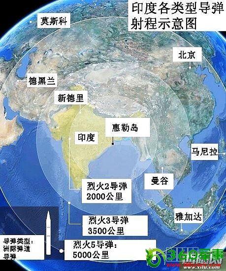 印度中远程导弹射程覆盖范围示意图,印度烈火-5导弹最远可打击俄罗斯首都莫斯科,波兰和乌克兰,以及日本和中国全境。