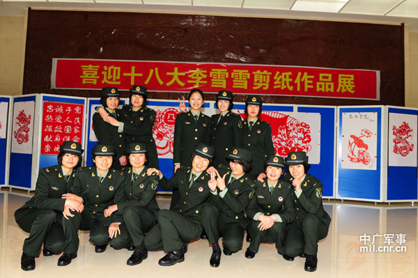 党的十八大即将召开之际,李雪雪为表达自己对党的十八大胜利召开的喜悦心情,她利用节假日或者课余时间,剪出寓意中国走向强盛的龙、象征中国共产党走过的“党的1921和2012”等作品。在李雪雪的带动下,班里其他战友也纷纷拿起剪刀向她“拜师学艺”,并别出心裁地自己设计,合作剪出长1.8米宽1.2米的《喜迎十八大》作品。旅政治部为表彰激励李雪雪及女兵班以独特方式向十八大献礼的热情,9月26日上午专门为她举办个人作品展。
